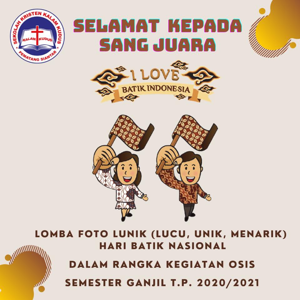 Dalam rangka mendukung program Classmeeting, OSIS SMA Kristen Kalam Kudus Pematangsiantar menyelenggarakan beberapa kegiatan selama semester ganjil dengan menggunakan media daring. Kegiatan kedua yang dilaksanakan yakni Lomba Foto LUNIK (Lucu, Unik, Menarik) mengenakan pakaian batik sebagai upaya mendukung Hari Batik Nasional (2 Oktober). Adapun tujuan dari lomba ini adalah un...