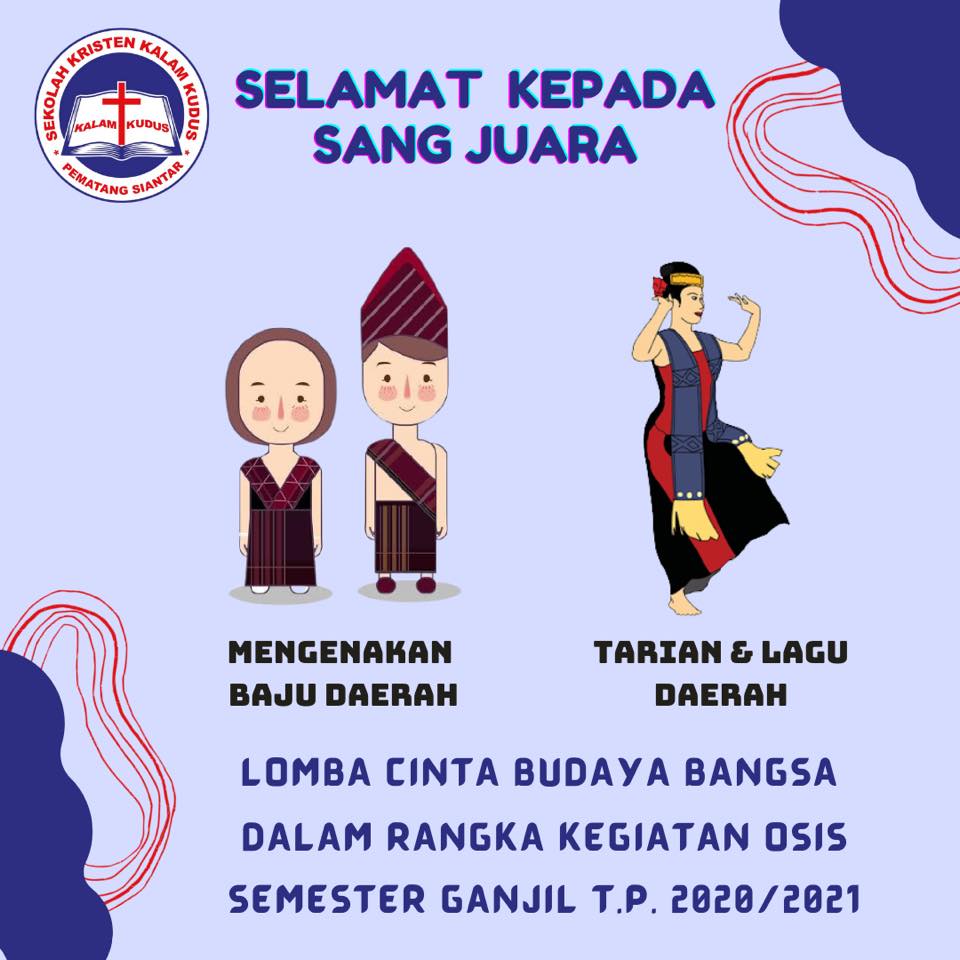 Dalam rangka mendukung program Classmeeting, OSIS SMA Kristen Kalam Kudus Pematangsiantar menyelenggarakan beberapa kegiatan selama semester ganjil dengan menggunakan media daring. Kegiatan ketiga yang dilaksanakan yakni Lomba Cinta Budaya Bangsa mengenakan pakaian daerah dengan menyanyi/menari tarian daerah. Adapun tujuan dari lomba ini adalah untuk menanamkan rasa nasion...