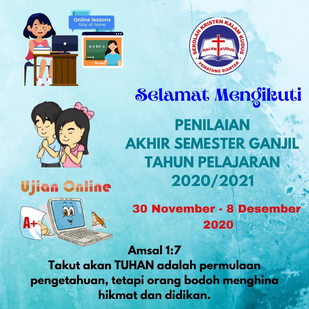 Siswa/i SMA Kristen Kalam Kudus Pematangsiantar akan mengikuti Penilaian Akhir Semester (PAS) ganjil secara DARING dari tanggal 30 November - 8 Desember 2020. Melalui evaluasi ini, peserta didik diuji pencapaian kompetensi materi pembelajaran di semester ganjil. Hasil evaluasi ini berguna bagi pendidik dan peserta didik untuk mengukur pencapaian standar kompeten...