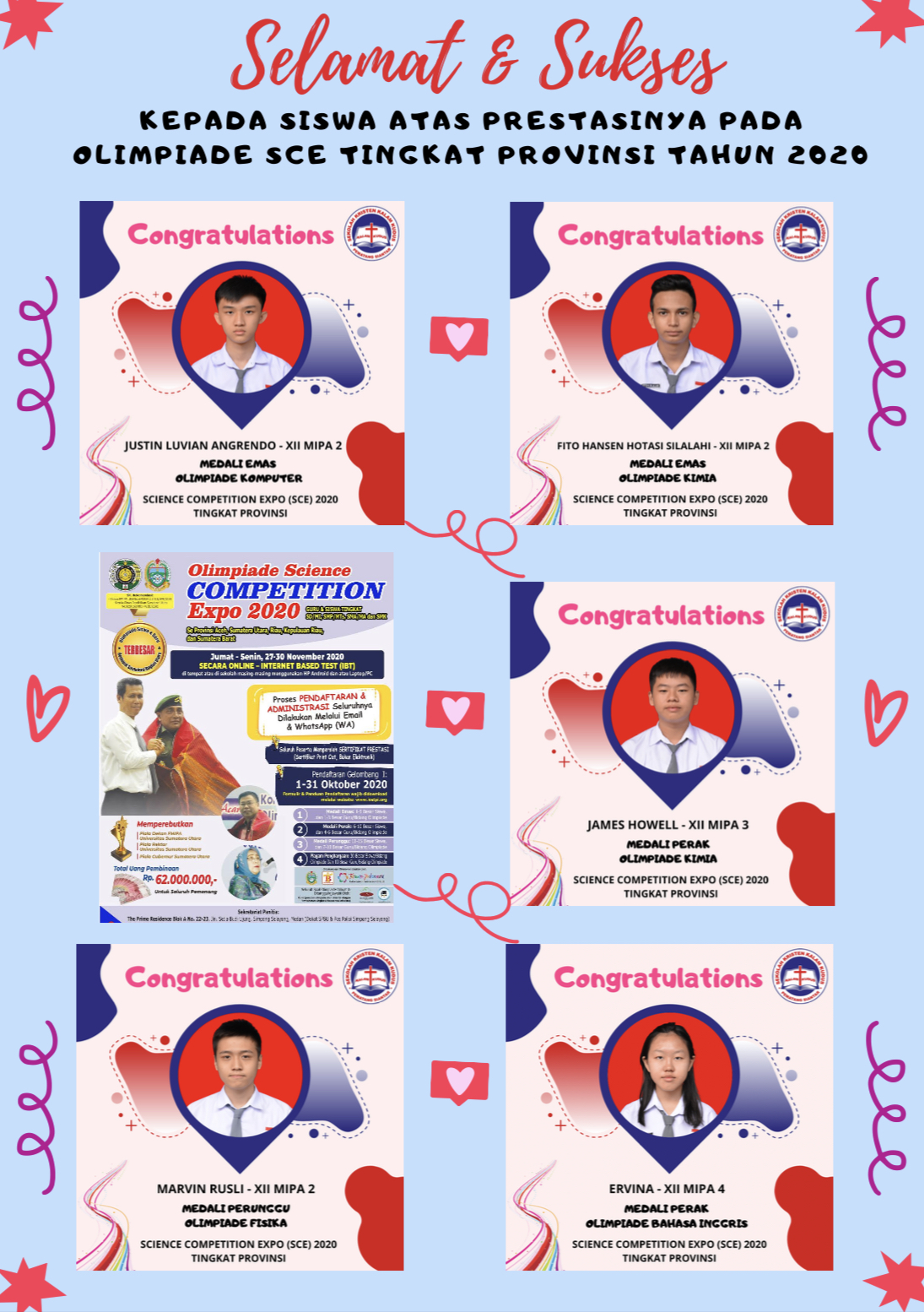 SELAMAT DAN SUKSES Puji Tuhan siswa/i SMA Kristen Kalam Kudus Pematangsiantar kembali meraih prestasi pada Olimpiade Science Competition Expo (SCE) tingkat provinsi tahun 2020 yang dilaksanakan secara online tanggal 27-30 November 2020. Semoga prestasi ini bisa memotivasi siswa/i lainnya untuk belajar keras meningkatkan kompetensi dan meraih prestasi demi kemuliaan Tuhan. &n...