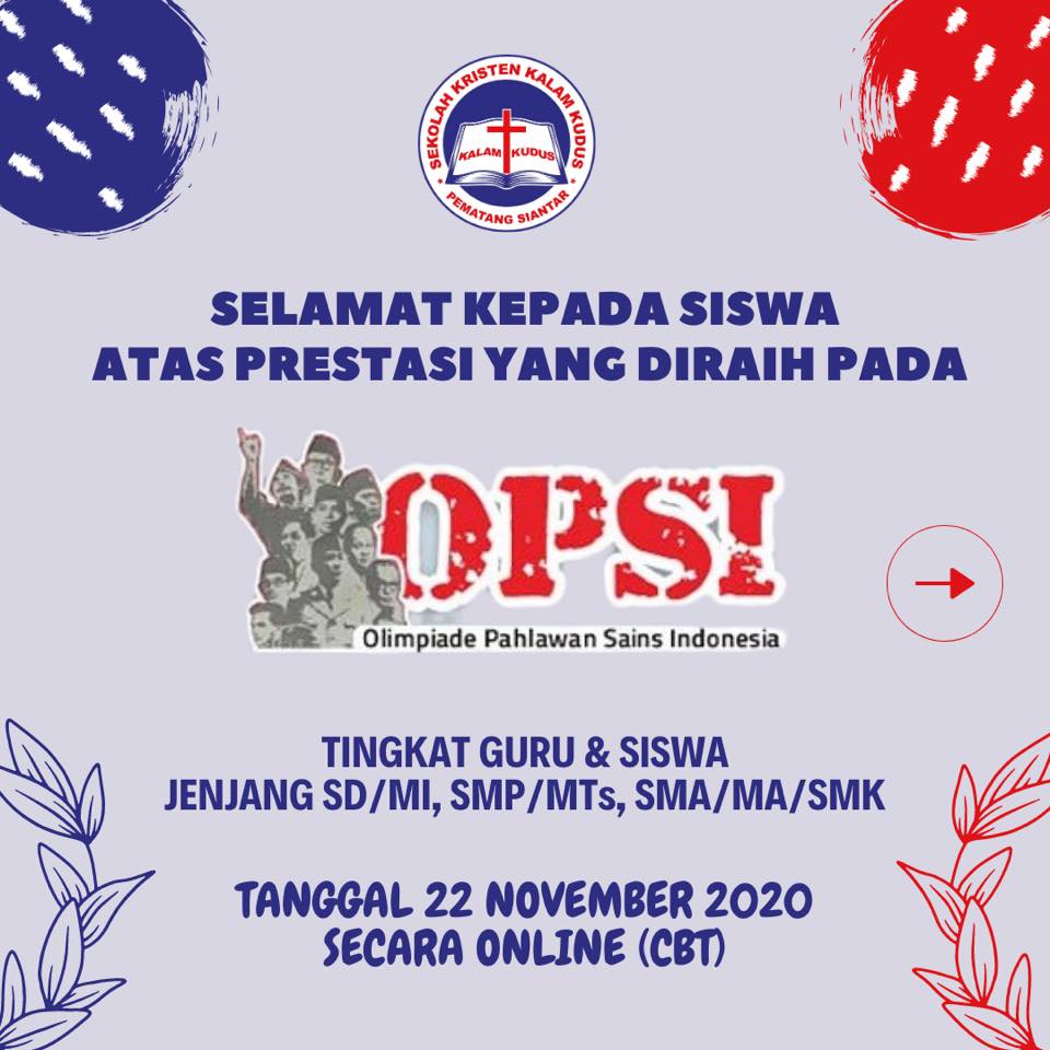 SELAMAT DAN SUKSES Puji Tuhan siswa/i SMA Kristen Kalam Kudus Pematangsiantar kembali meraih prestasi pada Olimpiade Pahlawan Sains Indonesia (OPSI) tingkat nasional tahun 2020 yang dilaksanakan secara online tanggal 22 November 2020. Semoga prestasi ini bisa memotivasi siswa/i lainnya untuk belajar keras meningkatkan kompetensi dan meraih prestasi demi kemuliaan Tuhan. &n...