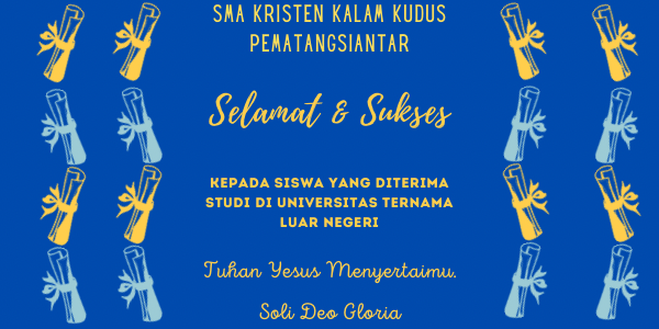 Badan Pengurus, Kepala Sekolah, Guru-Guru, Pegawai dan Karyawan mengucapkan selamat dan sukses kepada siswa SMA Kristen Kalam Kudus Pematangsiantar program NATIONAL PLUS (GLOBAL CHRISTIAN CLASS) yang telah diterima studi di universitas ternama luar negeri. Mari jadikan momentum ini menjadi gerbang awal untuk memperkaya pengetahuan, keterampilan dan kemampuan diri agar dapat berkon...