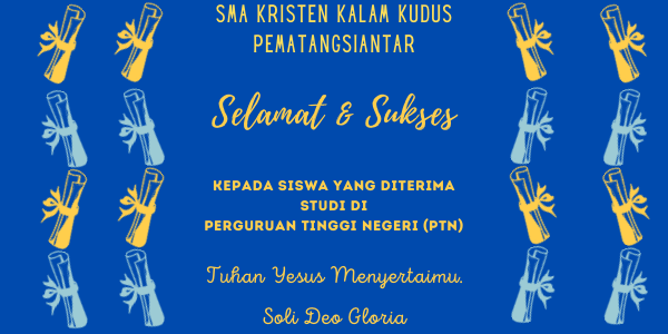Badan Pengurus Yayasan Kalam Kudus Indonesia Cabang Pematangsiantar, Direktur Pelaksana, Kepala Sekolah, Guru-Guru, Pegawai dan Karyawan mengucapkan selamat dan sukses kepada siswa SMA Kristen Kalam Kudus Pematangsiantar yang telah diterima studi di Perguruan Tinggi Negeri (PTN). Mari jadikan momentum ini menjadi gerbang awal untuk memperkaya pengetahuan, keterampilan dan kemampuan...