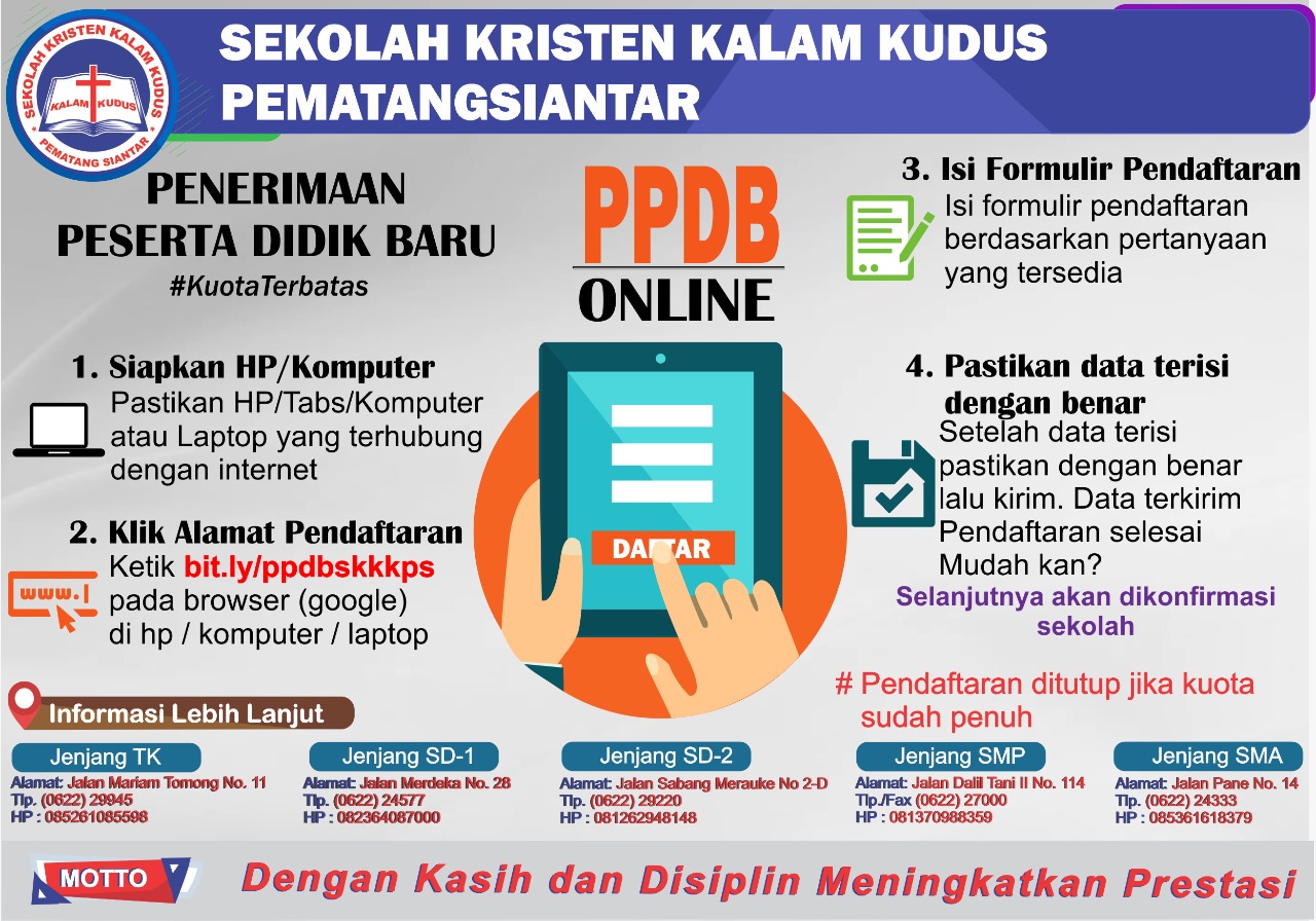 Salam sejahtera buat kita semua. Tidak terasa sesaat lagi kita akan memasuki tahun pelajaran baru 2020/2021. Mau daftar sekolah tapi harus Stay at Home. Tenang, Sekolah Kristen Kalam Kudus Pematangsiantar telah membuka Penerimaan Peserta Didik Baru (PPDB) secara ONLINE. Untuk melakukan pendaftaran, silahkan teman2 buka alamat website yan...