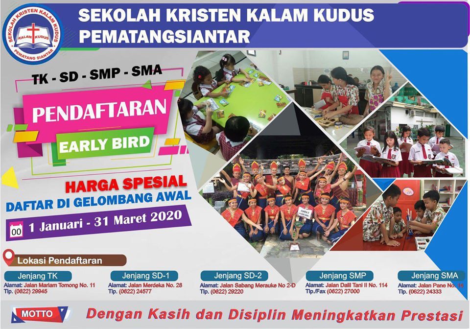 Telah dibuka pendaftaran Early Bird untuk penerimaan siswa/i baru TP 2020/2021. Pendaftaran Early Bird berlaku mulai tanggal 1 Januari - 31 Maret 2020 dan kami menawarkan harga special berlaku bagi siswa/i yang berasal dari Kalam Kudus Pematangsiantar maupun dari luar Kalam Kudus Pematangsiantar. Ayo tunggu apa lagi. Buruan daftar di Sekolah Kristen Kalam Kudus Pematangsian...