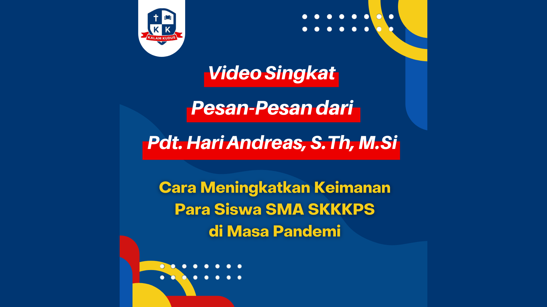 Sebuah video singkat berisikan pesan-pesan dari Pdt. Hari Andreas, S.Th., M.Si. : Cara meningkatkan keimanan para siswa SMA SKKKPS di masa pandemi ini. Yuk, mari kita tonton bersama. Godbless you.