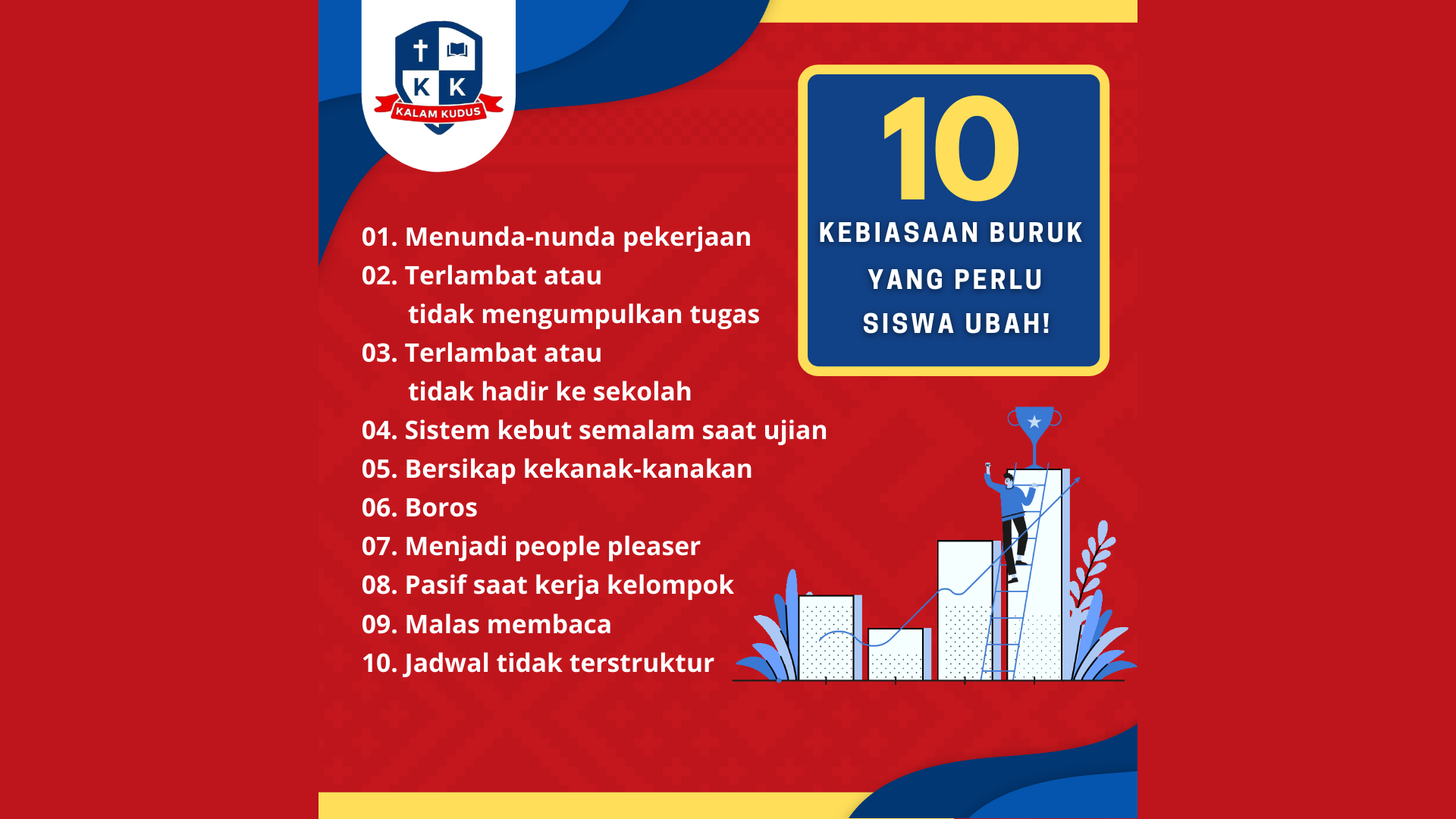 Proses belajar mengajar tidak selamanya dapat berjalan dengan baik. Tentu sering terjadi masalah dalam proses belajar mengajar. Masalah yang timbul datang dari berbagai sumber. Salah satu masalah yang dijumpai oleh guru adalah kebiasaan buruk siswa dalam belajar, sehingga menyebabkan siswa tidak mampu mencapai prestasi yang optimal. Berikut kami share 10 kebiasaan buruk yan...