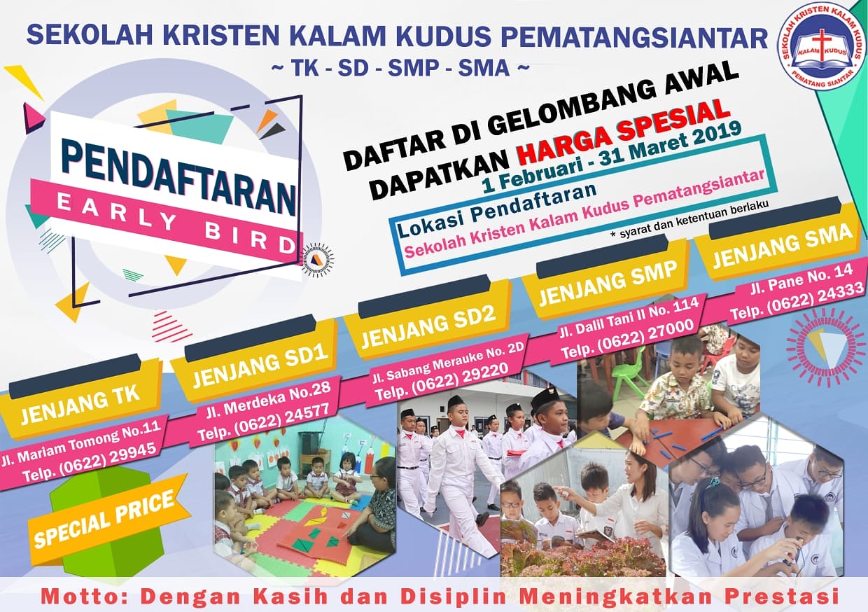 Telah dibuka pendaftaran Early Bird untuk penerimaan siswa/i baru TP 2019/2020. Pendaftaran Early Bird berlaku mulai tanggal 1 Februari - 31 Maret 2019 dan kami menawarkan harga special berlaku bagi siswa/i yang berasal dari Kalam Kudus Pematangsiantar maupun dari luar Kalam Kudus Pematangsiantar. Ayo tunggu apa lagi. Buruan daftar di Sekolah Kristen Kalam Kudus Pematangsiantar dan...