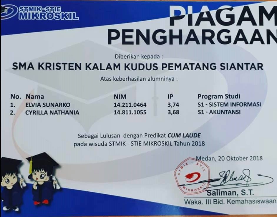 Congratulation to Elvia Sunarko and Cyrilla Nathania (Alumni siswa/i SMA Kristen Kalam Kudus Pematangsiantar Tahun Pelajaran 2013/2014) yang meraih lulusan dengan predikat CUM LAUDE pada wisuda STMIK -STIE MIKROSKIL MEDAN
