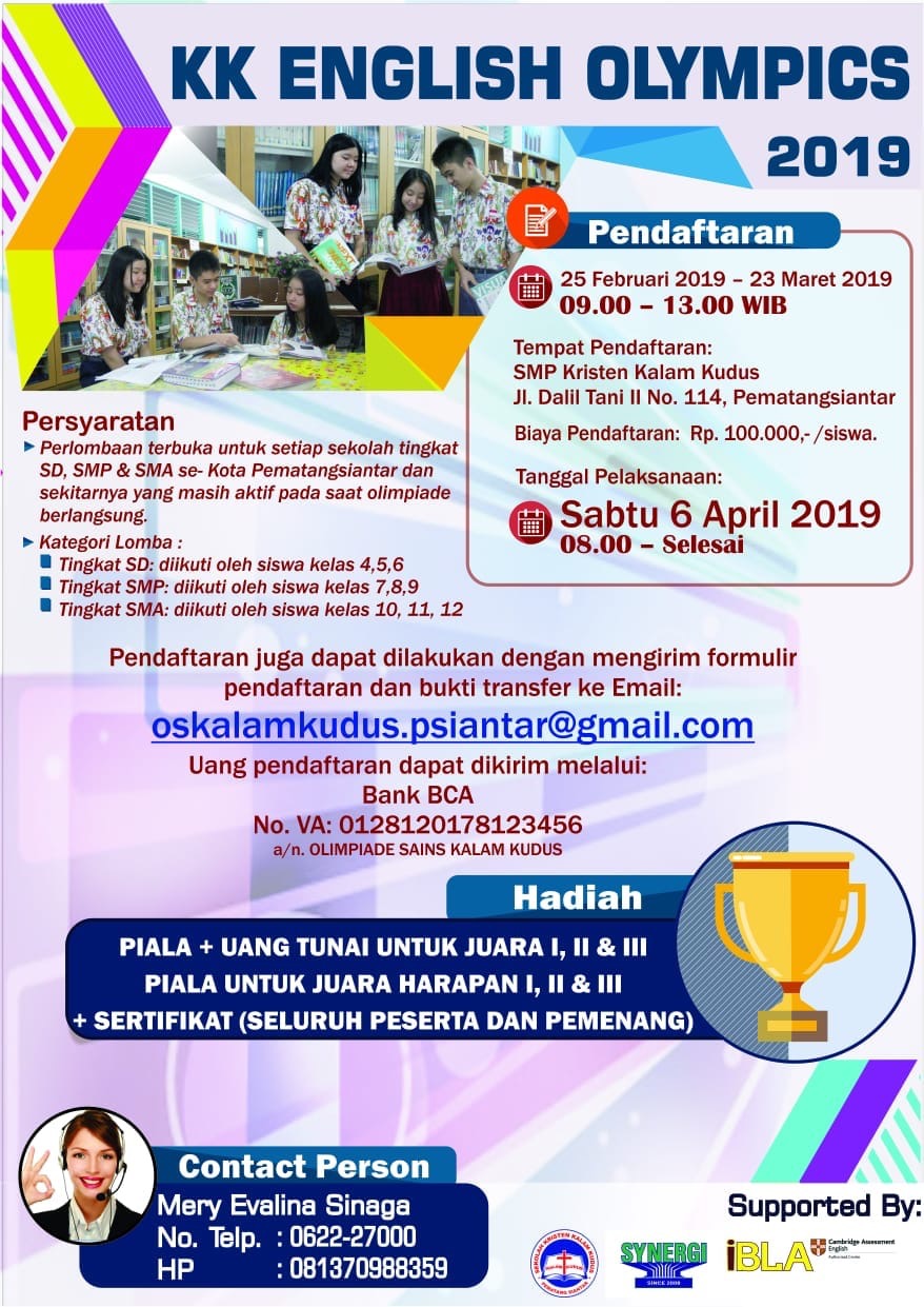 Sekolah Kalam Kudus Pematangsiantar bekerjasama dengan Internasional British Language Assesment (IBLA) menyelenggarakan English Olympic untuk siswa SD, SMP, SMA Pematangsiantar. Ayo segera daftarkan diri mengikuti kompetisi yang pertama kali di kota kesayangan anda.