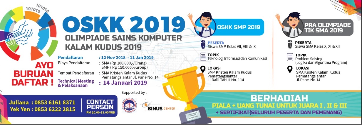 Olimpiade Sains Komputer Kalam Kudus (OSKKK) 2019 yang kedua kali dilaksanakan di Kota Pematangsiantar tanggal 14 Januari 2019 telah terlaksana dengan baik. Terima kasih kepada Binus Center yang mempercayakan Sekolah Kristen Kalam Kudus (SKKK) Pematangsiantar bersama menyelenggarakan uji kompetensi berbasis IT di bidang TIK (Teknologi Informasi dan Komunukasi) untuk siswa SMP dan Problem Solvin...