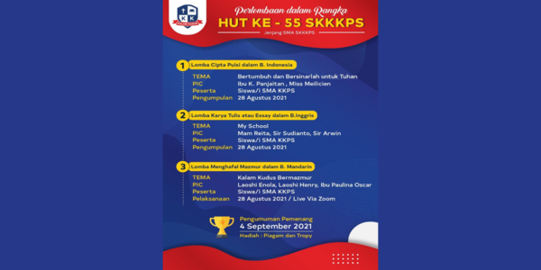 Dalam rangka merayakaan Hari Ulang Tahun ke-55 SKKKPS, SMA Kristen Kalam Kudus Pematangsiantar mengadakan lomba 3 bahasa secara virtual yaitu : 1. Lomba Cipta Puisi (Bahasa Indonesia)2. Lomba Karya Tulis atau Essay (Bahasa Inggris)3. Lomba Menghafal Mazmur (Bahasa Mandarin) Yuk! Kembangkan kompetensi dirimu secara kreatif dan inovatif. Tunggu apa lagi segera daftarkan...