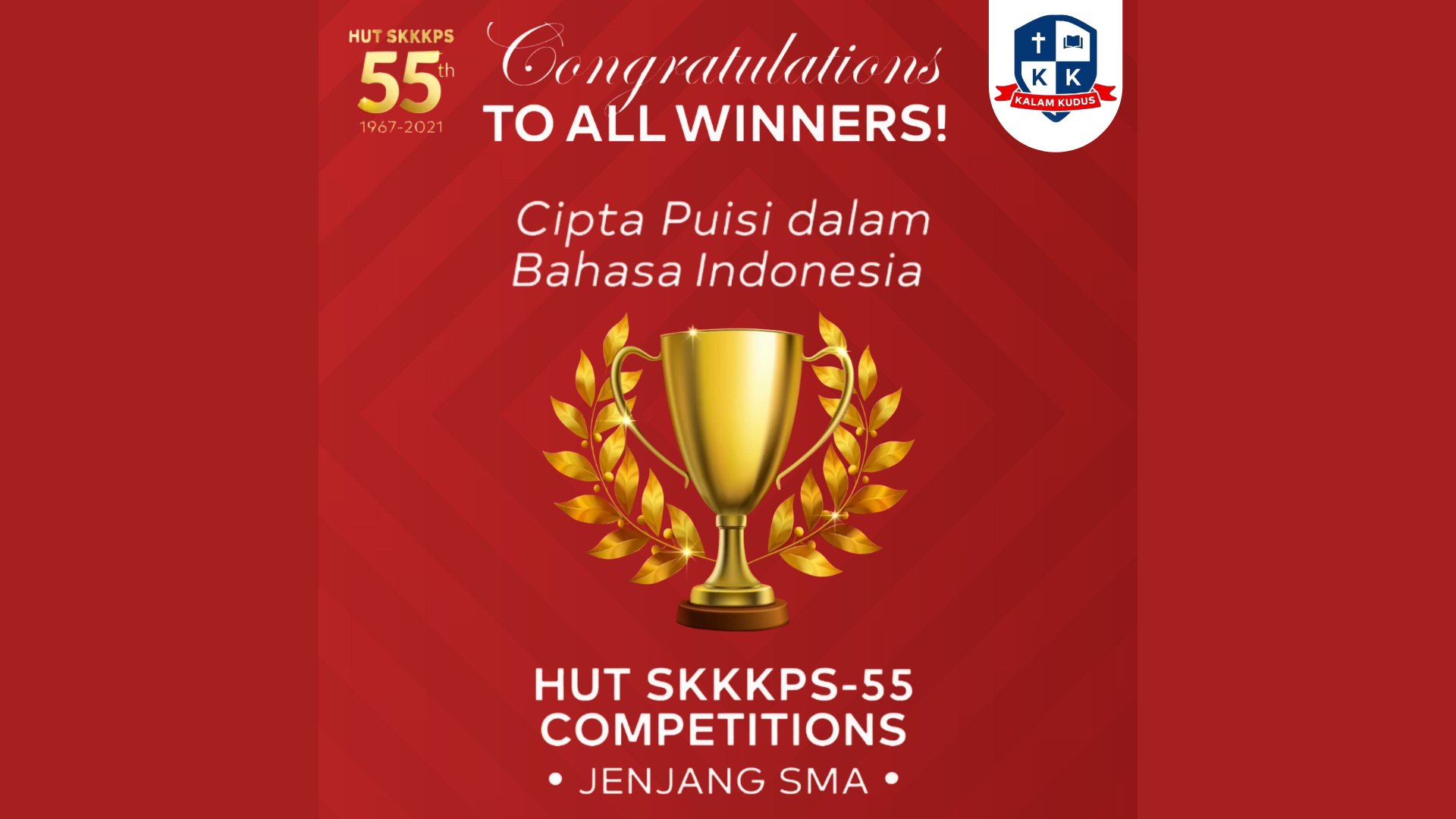 Selamat kepada sang juara “Cipta Puisi dalam Bahasa Indonesia” dalam rangka HUT ke-55 SKKKPS. Semoga prestasi ini bisa menginspirasi siswa/i lainnya untuk meraih prestasi di tengah pandemi dan memuliakan Tuhan. Kalam Kudus is the best. Soli Deo Gloria.