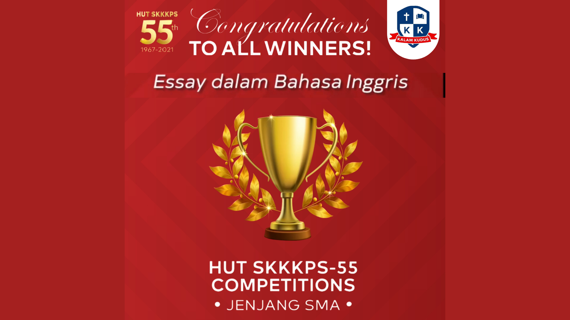 Selamat kepada sang juara “Essay dalam Bahasa Inggris” dalam rangka HUT ke-55 SKKKPS. Semoga prestasi ini bisa menginspirasi siswa/i lainnya untuk meraih prestasi di tengah pandemi dan memuliakan Tuhan. Kalam Kudus is the best. Soli Deo Gloria.