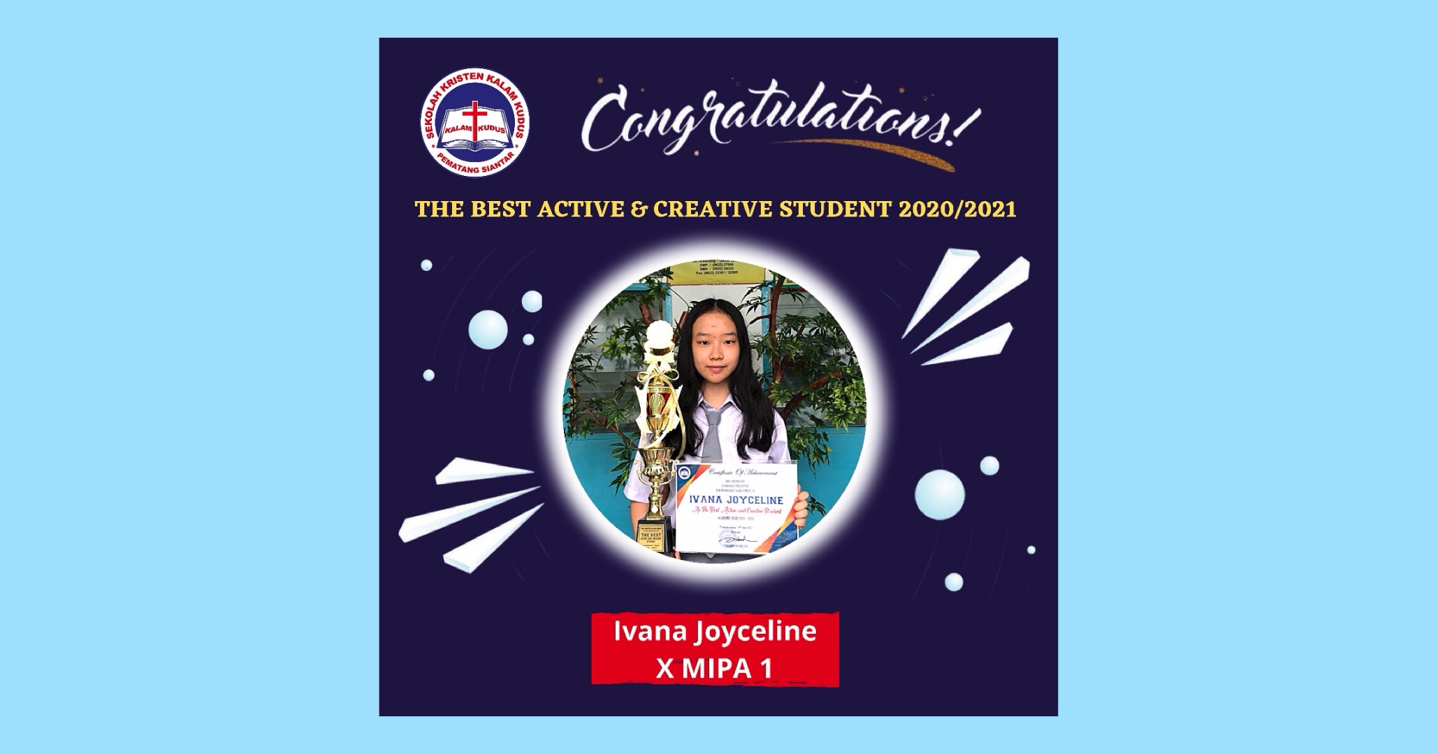 Puji dan syukur kepada Tuhan atas anugerah dan pertolonganNya kita telah menyelesaikan pembelajaran daring TP 2020/2021. Dalam situasi pandemi yang penuh tantangan dan keterbatasan ini, siswa diharapkan mampu menjadi pelajar yang aktif dan kreatif. Selamat kepada Ivana Joyceline kelas X MIPA 1 telah meraih "The Best Active & Creative Student 2020/2021”. &n...