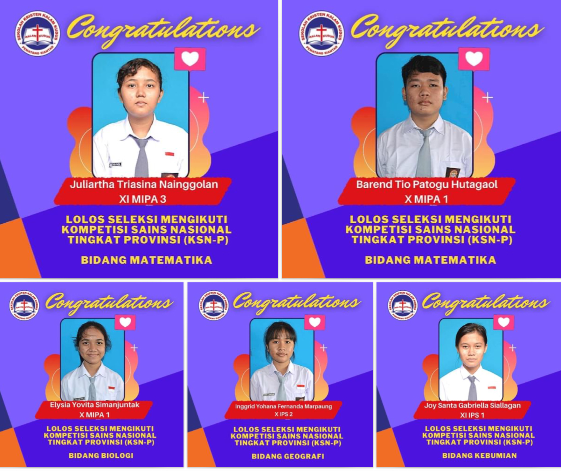 SELAMAT DAN SUKSES Puji Tuhan atas rahmat-Nya, siswa/i SMA Kristen Kalam Kudus Pematangsiantar kembali meraih prestasi pada Kompetisi Sains Nasional tingkat Kota (KSN - K) yang dilaksanakan secara online tanggal 3-4 Juni 2021. Terimakasih kepada siswa/i yang telah mempersiapkan diri dengan baik dan para guru yang dengan sabar membimbing siswa/i kita. Selamat kepada siswa/i yan...